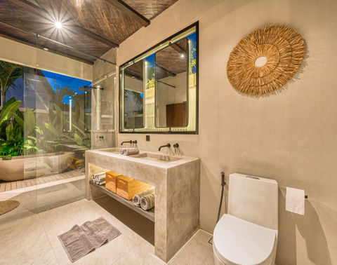 Bathroom Facilities: Luxurious bathroom facilities with amenities including rainfall shower, outdoor bath tub, double basins, toilet , hairdryer.